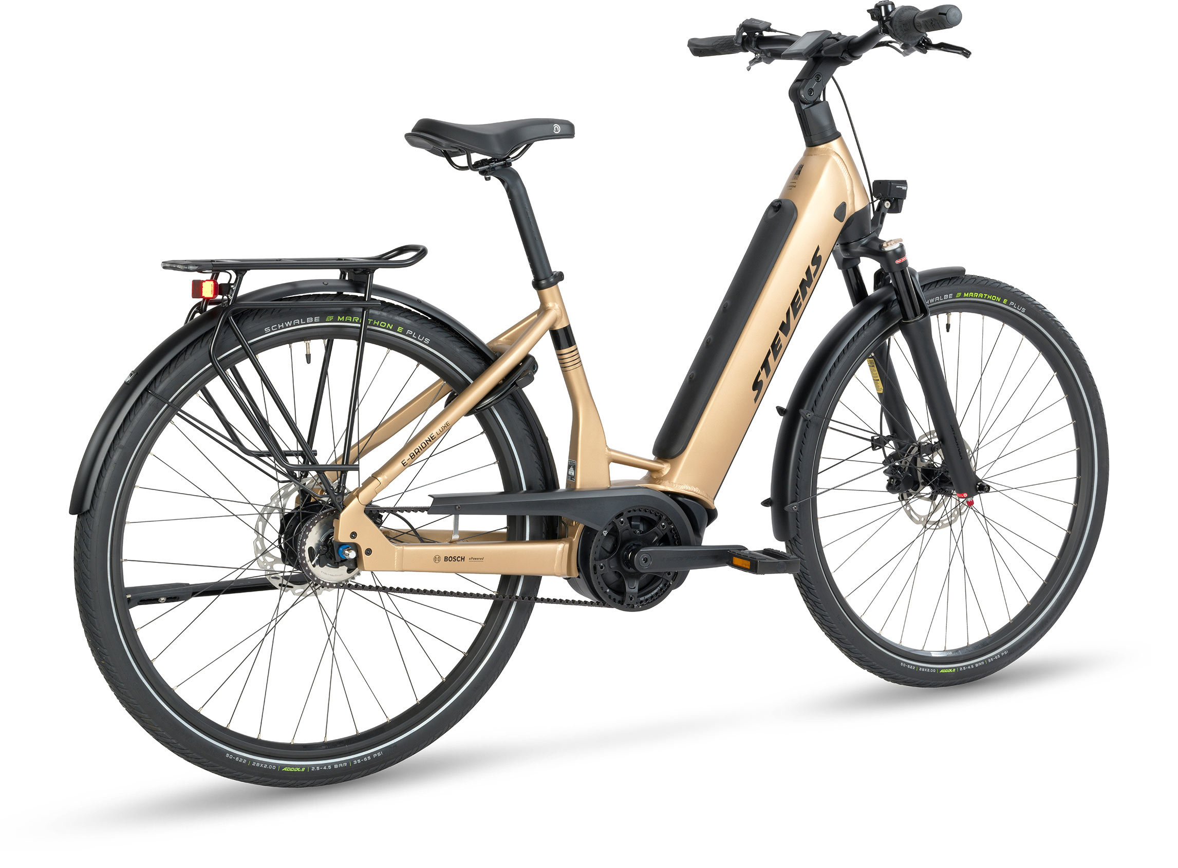 Lots of power and lots of control for the city: The STEVENS E-Brione Luxe takes the popular coaster brake of the E-Brione with it and packs plenty of extras on top: A stable PT6 step-through frame in four sizes with a fully integrated PowerTube 625 Wh battery for even more range, for example. Or the latest Bosch Performance Line drive unit with 75 Nm torque. On top of that, there is a practically maintenance-free Gates CDX belt, a finely responsive SR Suntour suspension fork and durable Schwalbe Marathon E-Plus tyres.