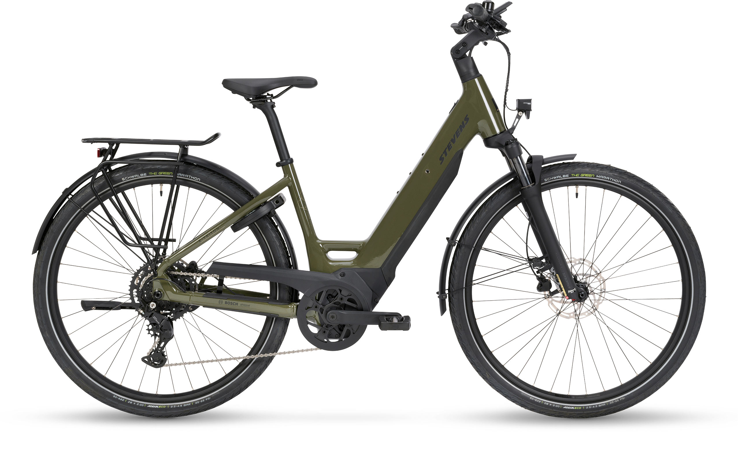 The E-Triton 5.5.1 is the solid entry-level model into the STEVENS E-Tour world. The Bosch Performance Line Drive Unit provides reliable support for commuting or trips into the countryside. The compact 545 Wh PowerPack battery ensures a slim, clean design of the down tube. The aluminium 6061 frame is available in Blue Hour as a high-tube (diamond frame) and in Khaki as a Forma variant (low step-through). The 9-speed Shimano CUES gear system offers seamless shifting and high reliability – even on rougher terrain. For added comfort, the handlebar stem can be individually adjusted to ensure optimal ergonomics.
