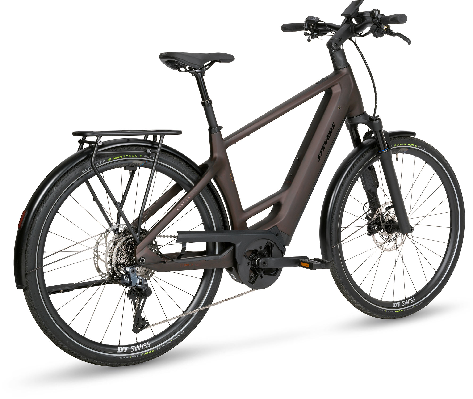 Schnell und sicher durch die City, über Pendlerrouten, Radwege und Flussufer. Das E-Triton 9.8.1 Plus ist unser Premium-E-Tour-Bike mit Carbonrahmen für Alltag und Abenteuer. Das veritable High-Tech-Gerät vereint unsere langjährige Erfahrung im Carbon-Rahmenbau mit edelster Touren-Technik. Der Bosch Performance Line CX Motor mit 800-Wh-Akku liefert starke Leistung und Reichweite. Die elektronische Shimano CUES Di2 11-Gang-Schaltung garantiert präzises, leises Schalten. Bosch-ABS mit Magura-Bremsen sorgt für maximale Kontrolle, Busch & Müller Fern- und Kurvenlicht für mehr Sicherheit. Das in edlem, rötlich-braunen Industrial Rust gehaltene "Plus"-E-Bike kommt mit 180 kg Freigabe und hochwertigen Komponenten – leicht, kraftvoll, souverän.