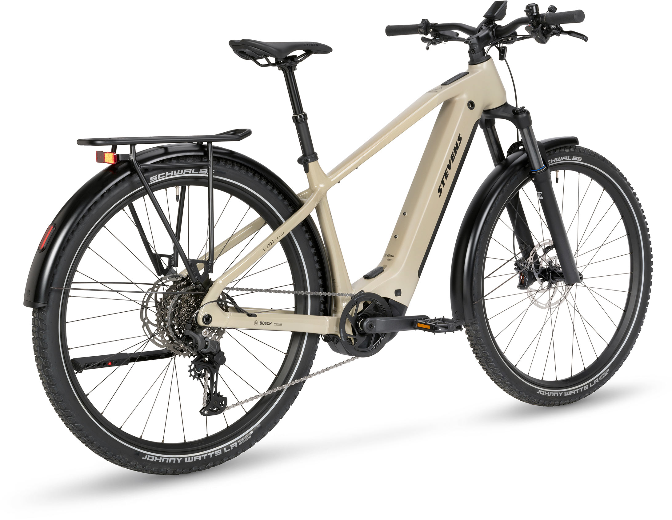 Whether on your morning commute to the office, on your after-work detour through the woods or on epic trail tours at the weekend – the E-Juke 7.8.1 FEQ impresses with the new Bosch Performance Line PX drive unit, combined with an 800 Wh PowerTube battery for record-breaking range in Eco mode. The high-quality suspension fork with 120 mm travel ensures optimum traction and comfort even on uneven terrain. The 60 mm Schwalbe Johnny Watts tyres with their versatile tread cover a wide range of uses from asphalt to off-road terrain – with high durability and excellent puncture protection. The overall package is rounded off by the complete FEQ everyday equipment with Supernova Mini Pro headlight (150 lux high beam), sturdy aluminium mudguards and robust luggage rack.